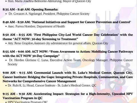 Throughout the morning, attendees will experience the launch of pivotal campaigns such as the "ACT NOW" initiative, partnerships with leading healthcare institutions like St. Luke's Medical Center QC Cancer Institute, East Avenue Medical Center, Lung Center of the Philippines for lung cancer screening, and intensified HPV vaccination efforts. Each session is designed to empower the community with knowledge and actionable strategies, from lung cancer screening advancements to anti-tobacco campaigns and policy discussions that support cancer prevention.