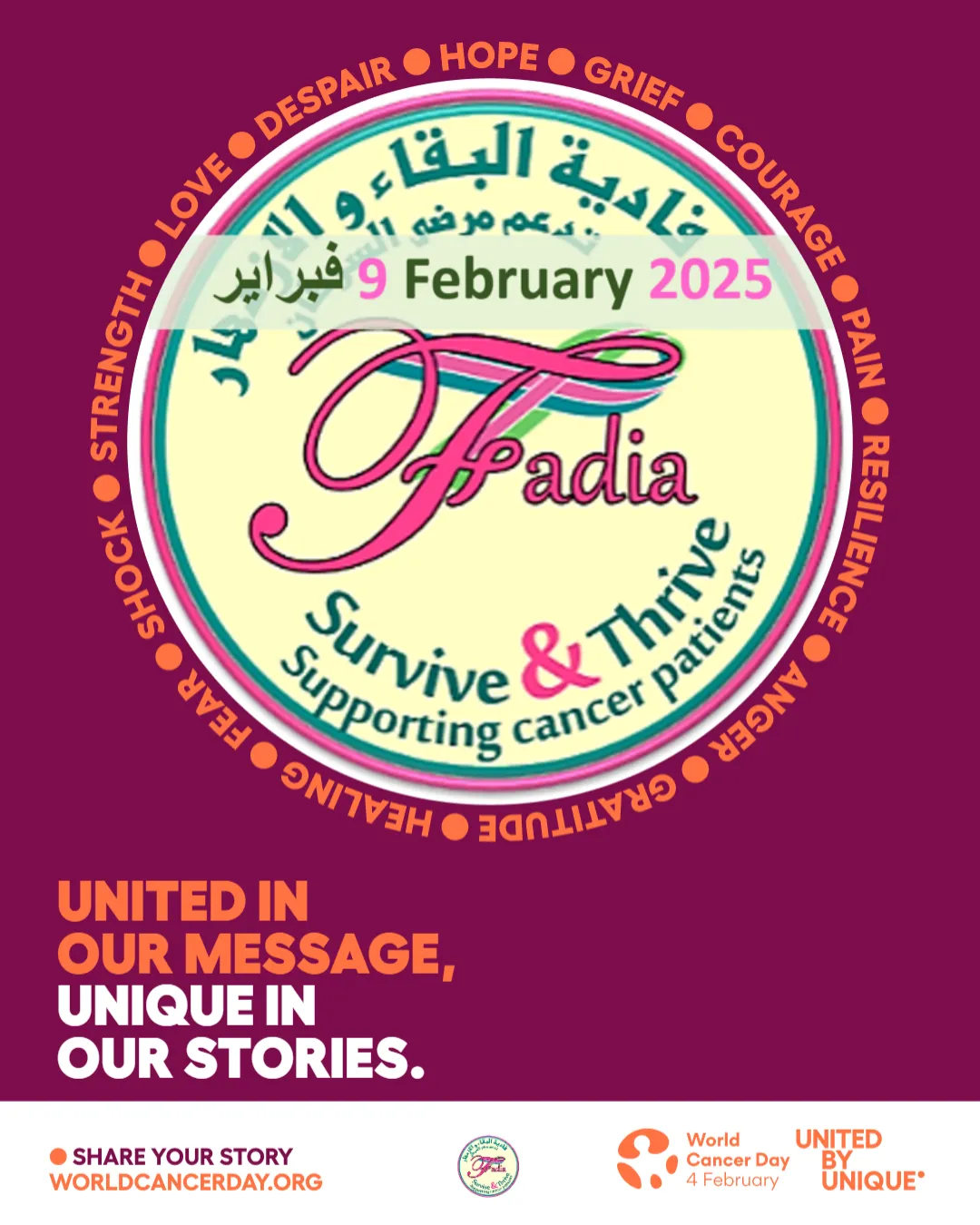 Fadia Survive & Thrive is organizing this year's World Cancer Day with a focus on unity in our message and the uniqueness of our stories. The event will feature courageous individuals sharing their inspiring cancer stories, whether they are patients, caregivers, oncologists, nutritionists, nurses, loved ones, friends, policymakers, or volunteers in this cause.