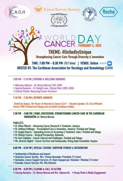 Welcome to our online webinar hosted by the Caribbean Association for Oncology and Hematology (CAOH) in recognition of World Cancer Day 2025. This year’s theme, #UnitedbyUnique, highlights the power of individual experiences in shaping a collective approach to cancer prevention and control.