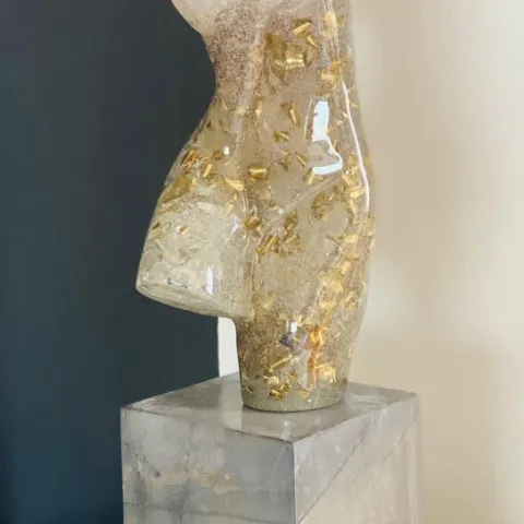 Después de crear varias piezas, sentí la necesidad de plasmar en una obra lo que significó el cáncer para mí. Así nació una escultura que representa un torso femenino, una obra en resina transparente que captura la vulnerabilidad y la fortaleza que convivieron en mi proceso. El torso tiene un corte transversal en el pecho, como una cicatriz abierta que no solo habla de las heridas físicas, sino también de las emociones y el aprendizaje que quedaron. A través de ese corte, el interior revela un brillo metálico de virutas doradas, un símbolo de la luz que encontré en medio de la oscuridad, de cómo las experiencias dolorosas pueden transformarse en belleza y crecimiento.