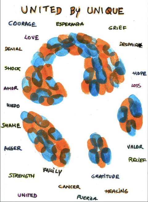 Using my fingerprints, I filled the space around "the person" with a spectrum of emotions—feelings that I imagine someone on a cancer journey might experience. As someone who lives my life in two languages, English and Spanish, I wanted to reflect that duality in the chosen words and colours of the fingerprints.